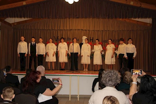 Azt mondod haza, s látod a térképet, a folyók, a tavak kékjét, a völgyek és síkságok zöldjét. Azt mondjuk haza, és képzeletünkben megelevenednek a történelemkönyv lapjai, és mesélni kezd a múlt. – szóltak a Faluházban az ünnepi műsor kezdő gondolatai Palotai Eszter felkészítésében az iskola hatodik osztályos diákjaitól.